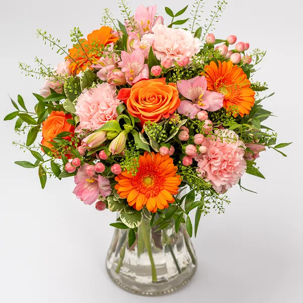 Zaskocz kogoś wyjątkowego piękną wiązanką delikatnych różowych kwiatów z wesołym, pomarańczowym akcentem. Zawiera kwiaty takie jak gerbery i goździki.Do bukietu warto dołączyć bilecik z życzeniami. Cena nie obejmuje wazonu. Na zdjęciu poglądowym przedstawiony jest bukiet w wersji dużej.